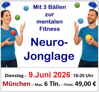 In diesem Workshop lernst Du nicht nur das Jonglieren mit drei Bällen, sondern auch, wie, wo und warum das Jonglieren in welchen Feldern positiv auf das Gehirn wirkt. Im Preis von 49 Euro sind eine 160-seitige Dokumentation “Jonglieren & Gehirn” sowie Imbiss und Getränke enthalten. Schnell anmelden,- die Teilnehmerzahl ist auf 6 Plätze begrenzt.